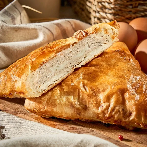 Plăcintă din aluat întins, carne tocată de pui, sare, piper.