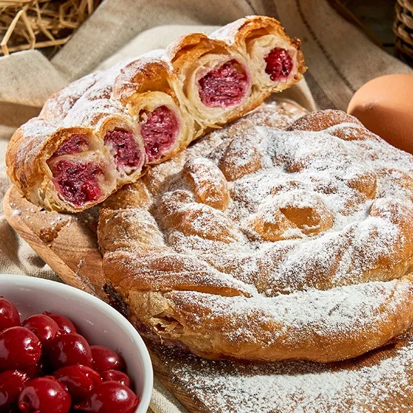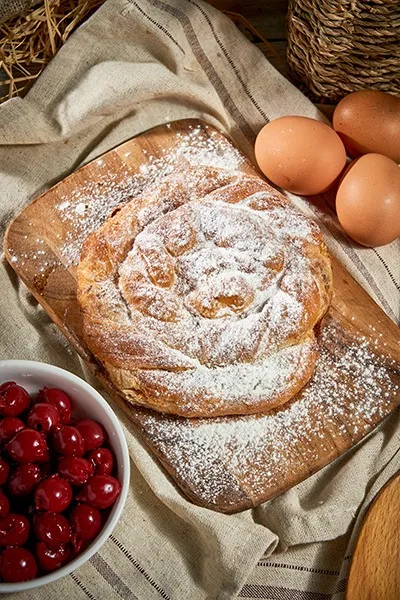 Plăcintă din aluat întins, cu vișină în suc propriu și zahăr pudră.
